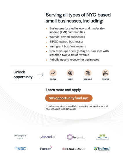 Jan 27, 2023If you’re a NYC-based business – a startup, growth-stage, or needing a boost after the pandemic – the NYC Small Business Opportunity Fund is a trusted, affordable way to invest in your business.