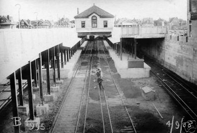 Before the Brighton line was submerged as part of the Grade Crossing Elimination Project, memorialized in a plaque on the east wall of the Plaza station house, the railroad planned to add two tracks for express service and an express station in Flatbush south of Church Avenue. To do this it needed to add about 20 feet on each side of its existing 50-foot right of way. Cortelyou Road and Newkirk Avenue were the only alternatives considered. Cortelyou Road had a trolley that intersected with the railroad and an expanding commercial strip. Its merchants lobbied hard for the express, realizing the additional foot traffic it would produce. But too many buildings lined the tracks around Cortelyou, making expansion of the roadbed impracticable. And so an agreement was reached with the landowners surrounding the Brighton line’s two surface tracks at the Newkirk stop. The railroad secured an easement of 19.5 feet on each side to make room for two island platforms between the local and express tracks. In return, the railroad restored to the property owners the entire width of the easement by constructing concrete pavement at ground level to form a roof over the local tracks.